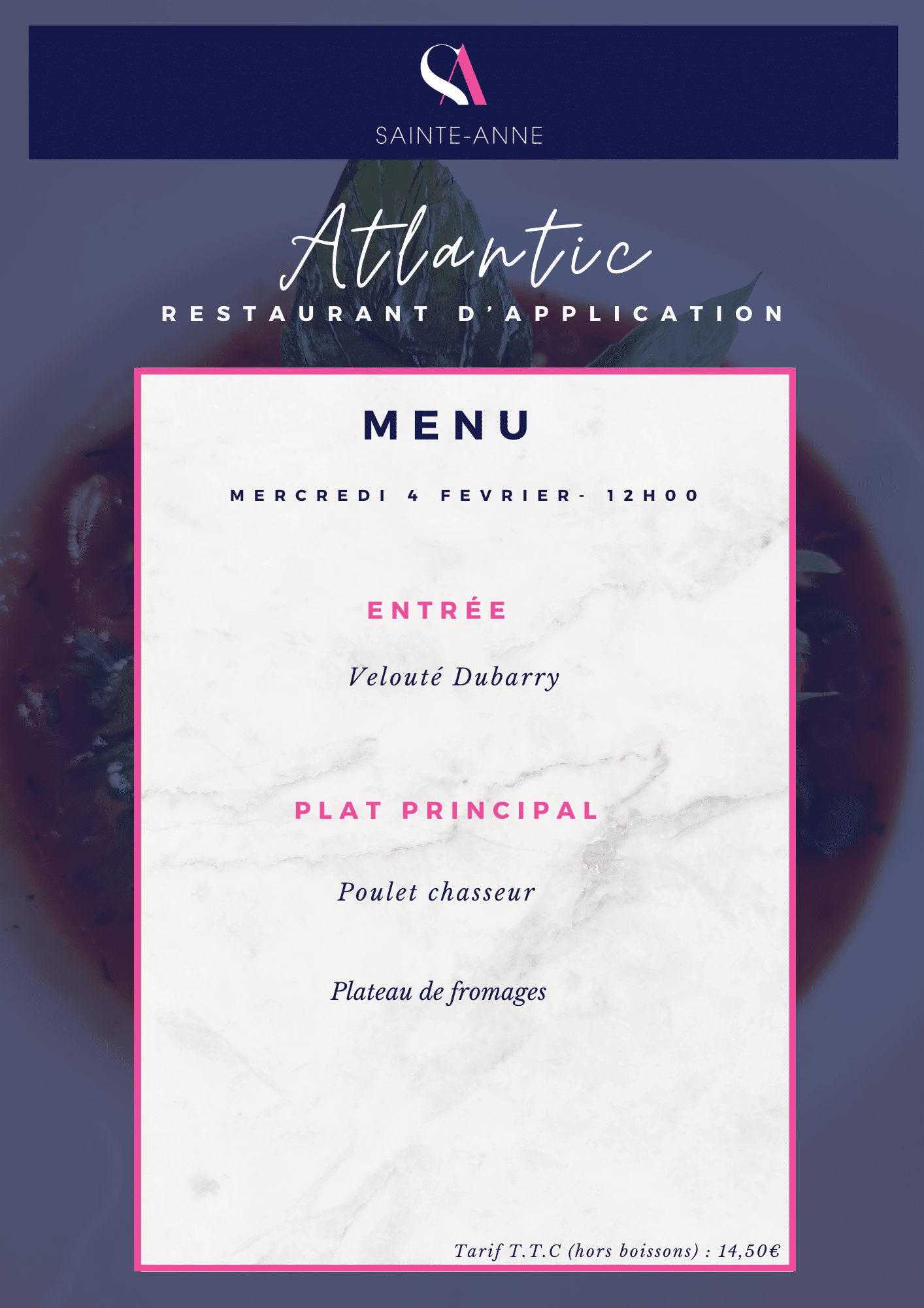 Nous vous proposons de vivre ces soirées exceptionnelles et la dégustation de plats succulents préparés et servis par nos élèves et étudiants encadrés de leurs enseignants.